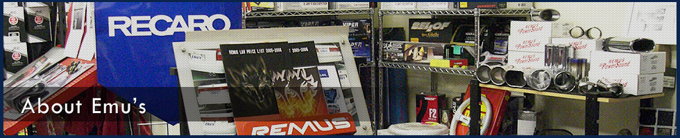 平成7年オリジナルマフラー(115φ砲弾サイレンサー)をワゴン車に取り入れ,製造・販売をはじめる。 平成7年頃より併設店舗にてカー用品全般の販売開始。 平成10年 REMUS TECHNICAL FACTORY認定を受けREMUS R.T.F MODEL MUFFLERの製造、販売を開始(現在は生産終了)。 オリジナルエアロ、オリジナルマフラー、オリジナルシートカバー他アフターパーツ等EMU'S製品の開発・製造・販売を手掛けていく。 平成14 年現在の店舗にてリニューアルオープン。 以後、輸入車用オリジナルパーツの開発・販売を開始。 併設店舗にて輸入車用アフターパーツの販売・取付作業も本格的にはじめ現在に至る。 ・ECS TUNING正規代理店 ・POWERFLEX正規代理店 ・UNITRONIC正規代理店 ・CTS TURBO正規代理店 |